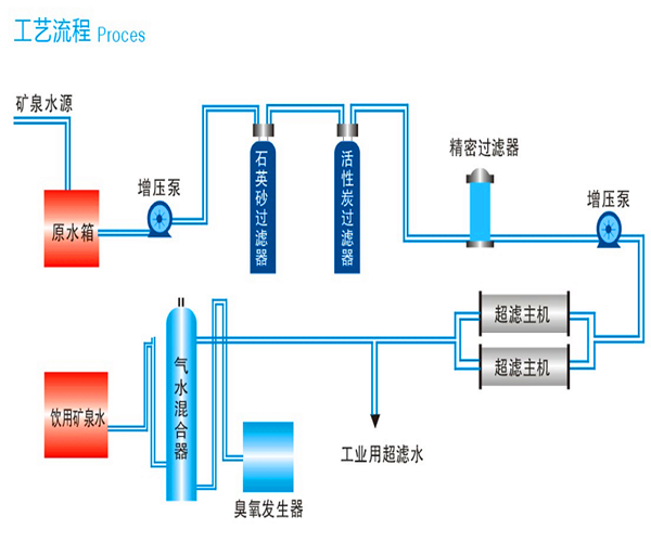原水箱→原水增壓泵→機(jī)械過(guò)濾器→活性炭過(guò)濾器→5μm精濾→超濾主機(jī)→凈水箱→灌裝→成品