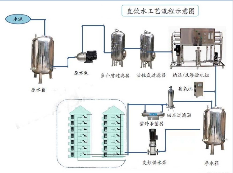 直飲水設(shè)備是由原水箱、增壓?jiǎn)卧?、預(yù)處理單元、膜主機(jī)單元、循環(huán)供水單元、消毒單元、自動(dòng)控制單元、專用管網(wǎng)、專用水表、各式飲水終端等組成。